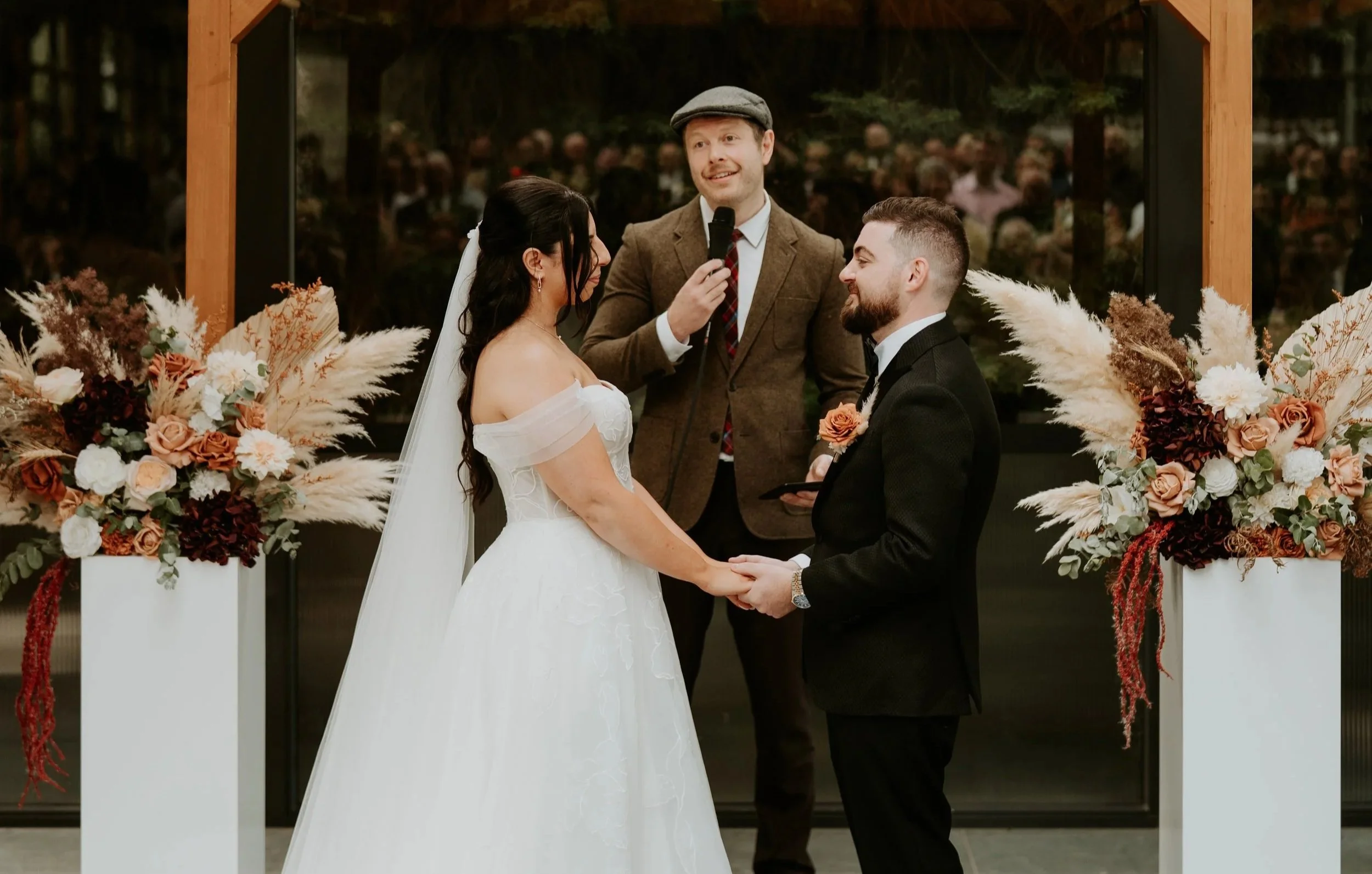 Welcome & Ceremony: Guests were greeted by a floral welcome sign, styled in the same warm palette with greenery and dried textures. For the ceremony, we used plinths and plinth arrangements to frame the space and create a beautiful focal point without overwhelming the venue.