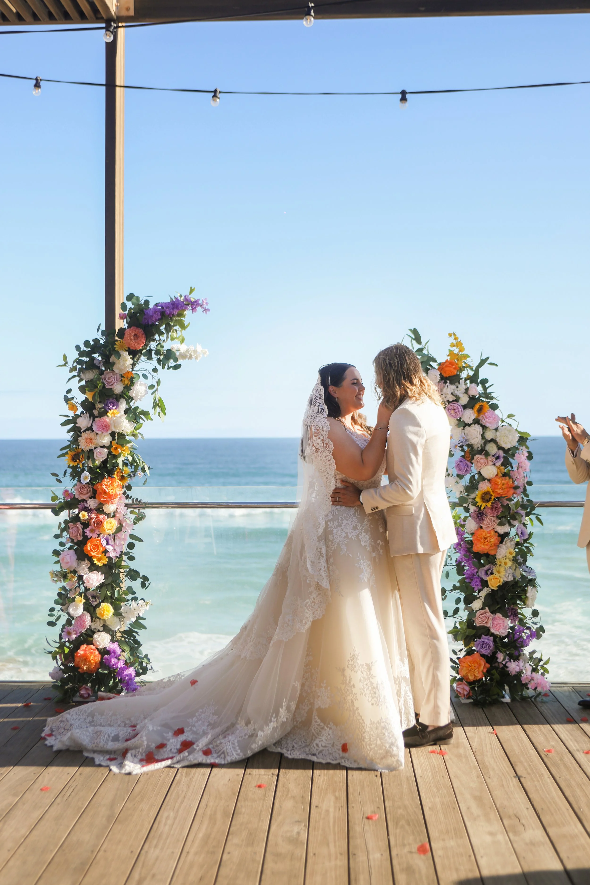 Ceremony: We created sculptural floral “horns” flanking the couple. Two curved, asymmetrical installations rising from the ground and arcing outward to frame the moment without blocking the ocean outlook. Built with high‑quality everlasting blooms in bold brights and layered with greenery for movement.
